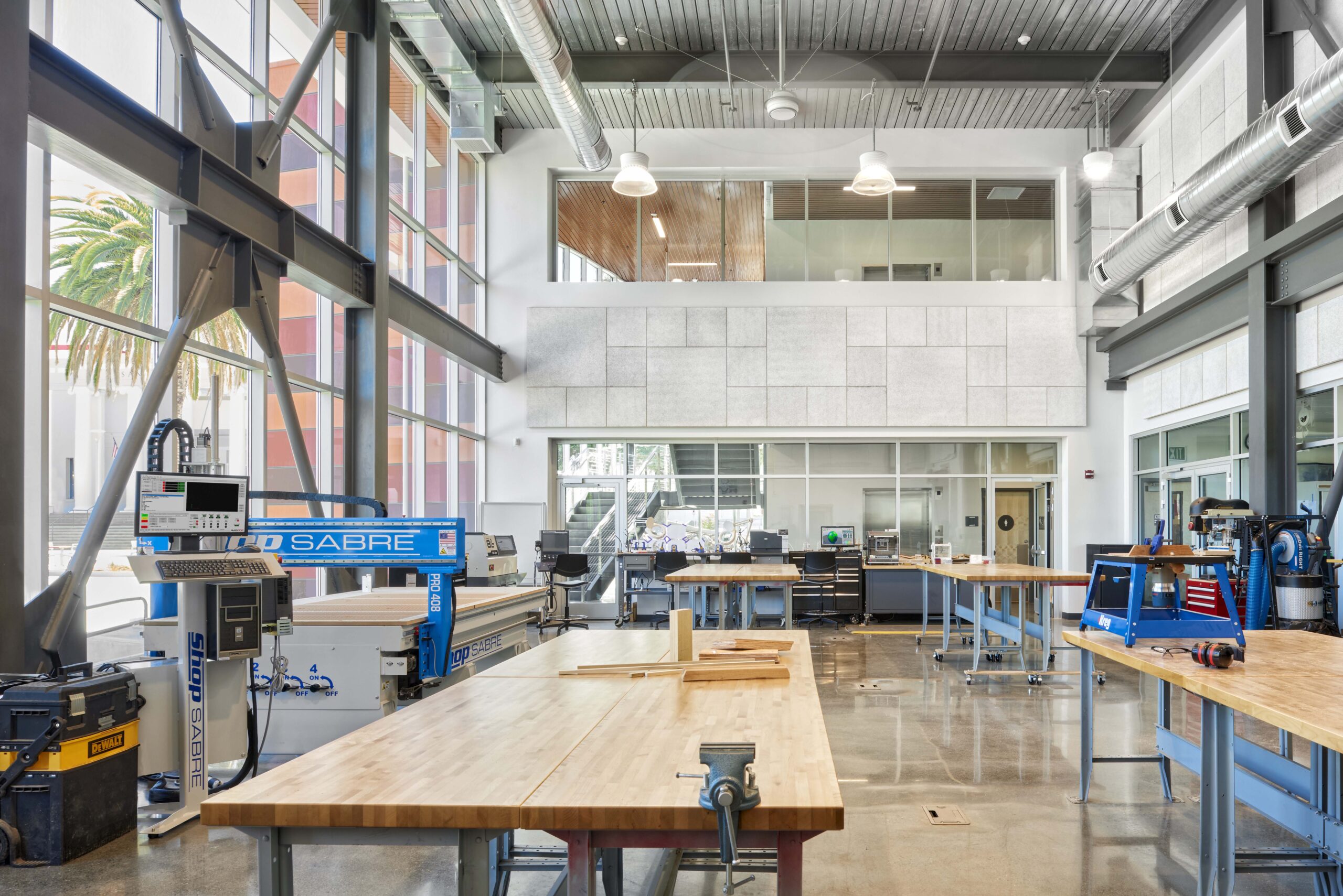 The new STEAM building includes a variety of specialized spaces such as a physics academy, science and engineering labs, a fabrication laboratory/maker space, and digital arts and music composition labs. Additional program elements include a ceramics studio, woodshop, 3D printer and plasma cutter rooms, general classrooms, and an outdoor arts patio.
